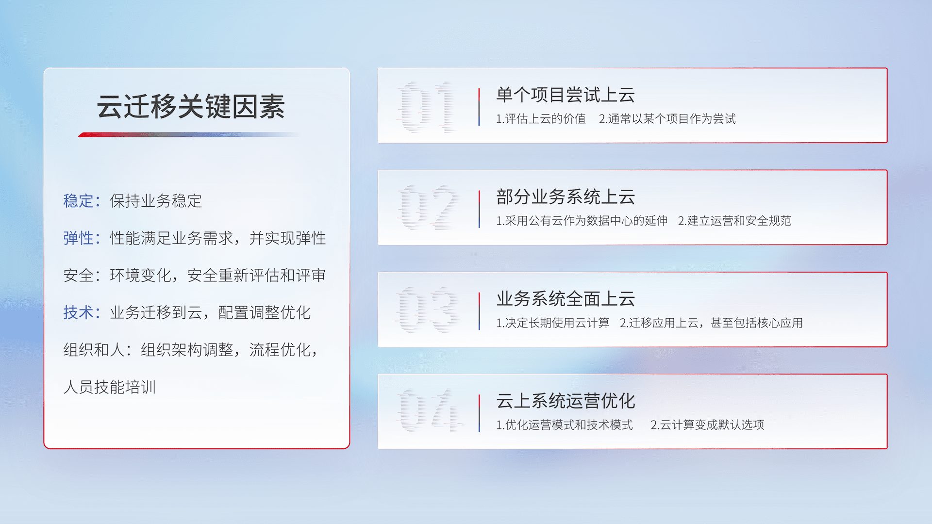 结合实际业务,,,从规划设计、、云平台选型、、、云原生改造、、数据迁移、、、集成交付,,迁移全过程为客户识别最佳上云路径,,做好风险识别管理,,,设计网络架构、、、身份权限、、安全审计合规、、、、操作审计、、、日志审计、、监控告警策略、、、、多站点容灾设计等,,,,对云上基础设施进行整体规划,,提升IT治理水平,,,,以满足弹性、、、高可用、、、、高性能的需求。。