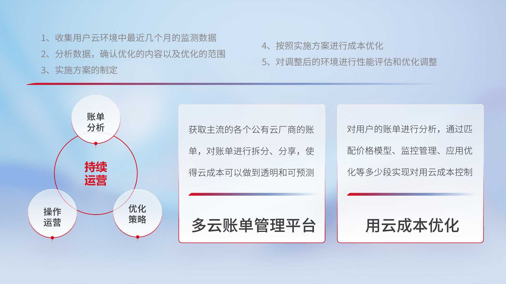 通过多云纳管,,,以统一的资源数据模型把客户的云资源进行抽象和封装,,,,进而实现对多云资源的统一操作,,保障云资源管理的可靠性、、稳定性与可用性。。量身定制化运维内容,,,配置、、、、开发运维、、补丁管理、、备份、、、监控、、认证和访问管理、、、、审计和日常巡检等,,,,保障在用云过程中的可靠度,,稳定度以及高可用率。。。